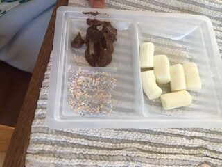 ①袋に書いてある通り、本当に2ステップでした。キッドの中にバナナのソフトキャンディとチョコとチョコスプレーが入っていて、容器にチョコとチョコスプレーを準備してバナナのソフトキャンディにチョコとチョコスプレーをつければ完成でした。